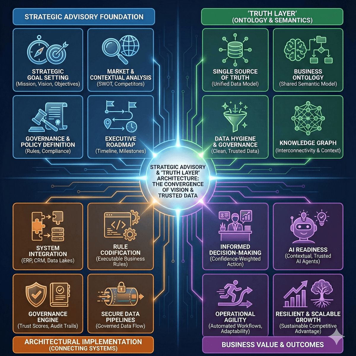 The 'Strategic Advisory & 'Truth Layer' Architecture infographic shows its four constituent quadrants. It provides a high-level objective for each quadrant and detailed explanations for the sixteen specific components within them.